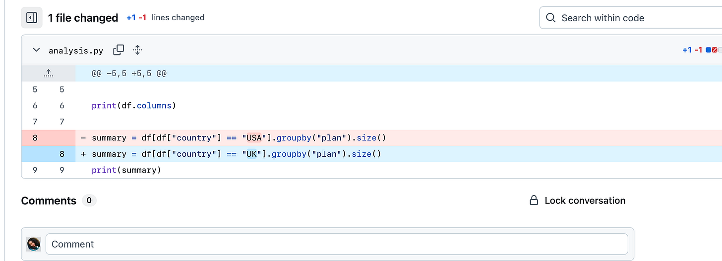return df[df[”country”] == country].groupby(”plan”).size()Next, write a test for it and call it tests/test_analysis.py: