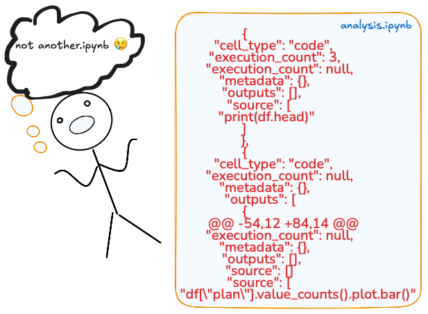 For a .py file that’s clean, but for a .ipynb file, you may be scrolling through lines of JSON completely blind.
