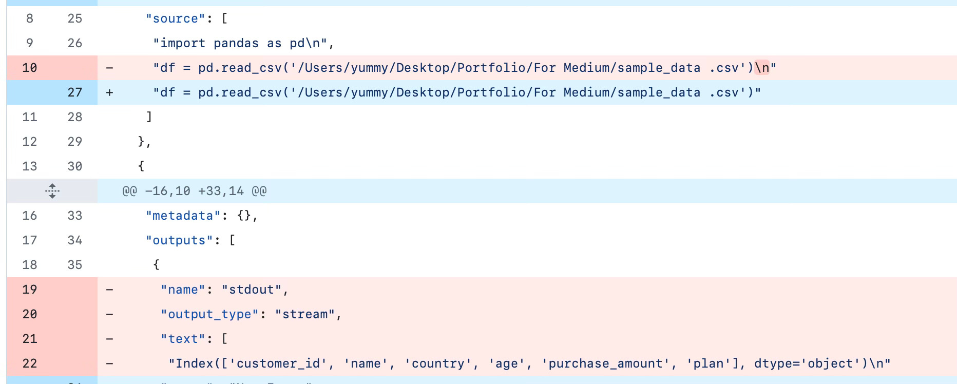 When you add a notebook to Git and try to review the changes later, Git displays a diff (the difference between 2 versions).